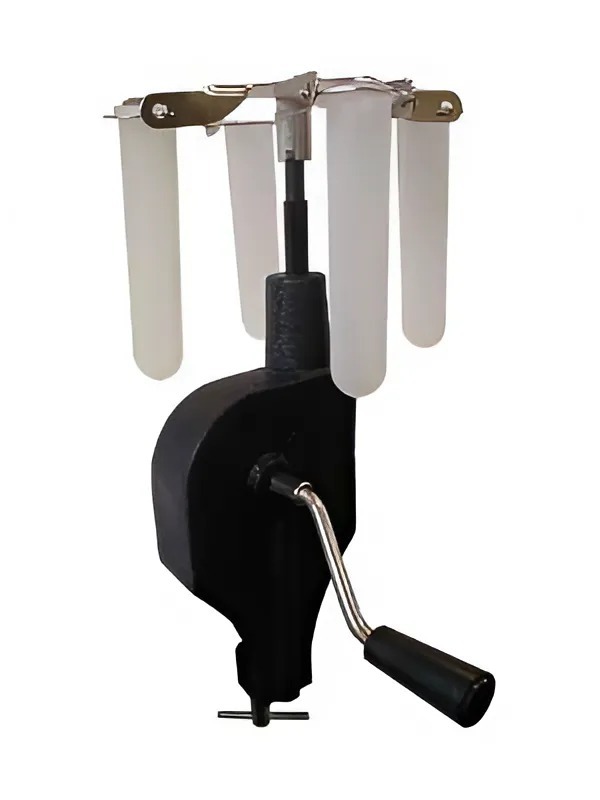 Прибор состоит из крестообразной пластины с вилками на концах. К вилкам подвешены на осях кольца с пластмассовыми полыми цилиндрами для вкладывания в них стеклянных пробирок. Пластина закреплена с помощью втулки на шпинделе центробежной машины. Передача вращательного движения от рукоятки к шпинделю осуществляется посредством червячной передачи. Отношение числа оборотов рукоятки к числу оборотов шпинделя 1:16.