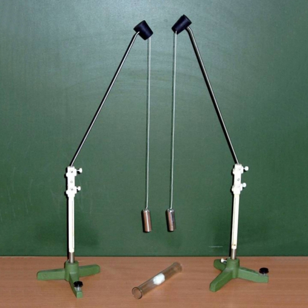 Перед демонстрацией необходимо продеть нити маятников в трубки, затем которые закрепить на стержнях. Длина нитяного отвеса около 300 мм. Собранные маятники закрепить в штативах. После демонстрации маятники разобрать и уложить в пробирку.