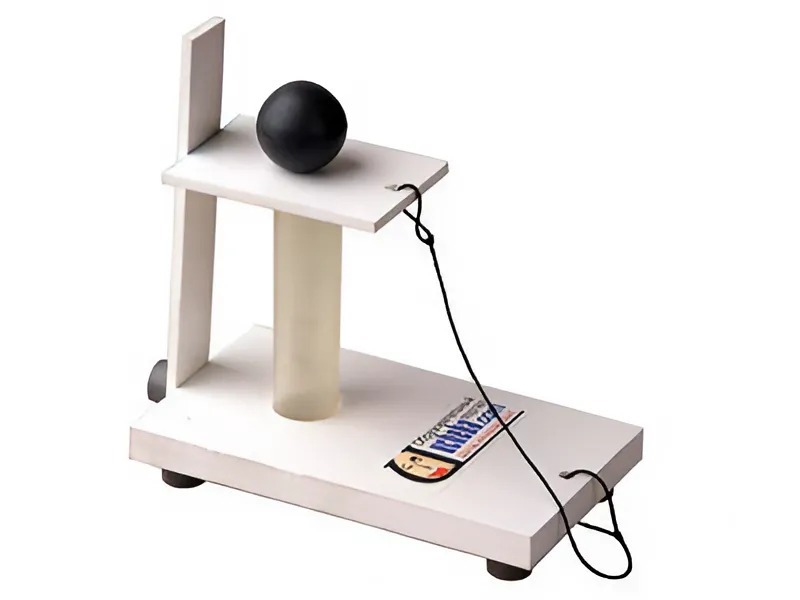 Прямоугольная пластина с нитью привязана к площадке. На шарике имеется небольшое углубление для устойчивого его положения на горизонтальной поверхности.