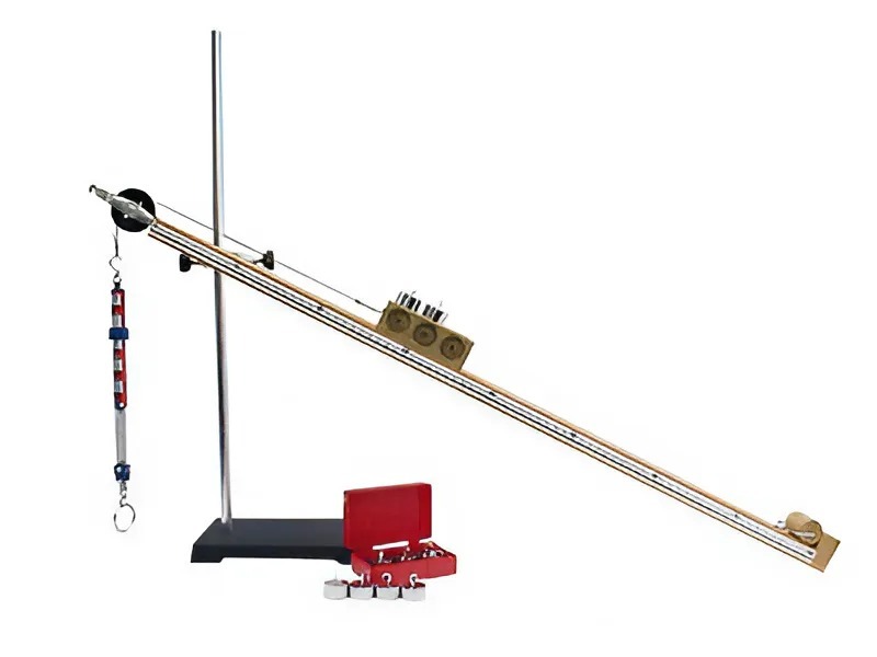 Прибор состоит из доски длиной 82 см, на одном торце которой установлен блок, а на другом – бортик для задержки тел, скользящих по наклонной плоскости. Одна боковая грань имеет шкалу, оцифрованную через 10 см, на другой боковой грани есть отверстие для стержня.