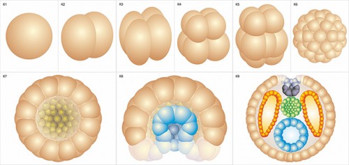 Онтогенез хордового животного начинается со стадии оплодотворенной яйцеклетки - зиготы. Зигота претерпевает несколько митотических делений. Во время первого деления зигота делится в продольном направлении на две клетки, называемые бластомерами. Каждый из бластомеров также делится в продольном направлении, и на следующей стадии бластомеров уже 4. Следующее деление происходит в поперечном направлении и формируются 8 клеток. Число бластомеров увеличивается:16, 32, 64 и так далее.