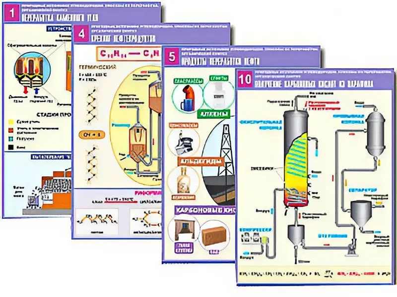 Комплект таблиц по органической химии "Природные источники углеводородов. Переработка. Синтез" (12 таблиц, формат А1, ламинированные)