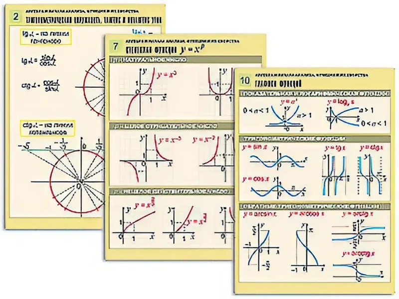 Комплект учебно-наглядных пособий "Алгебра и начала анализа. Функции и их свойства" формата А1 с полноцветной двухсторонней печатью и матовой двухсторонней ламинацией в количестве 14 таблиц.
