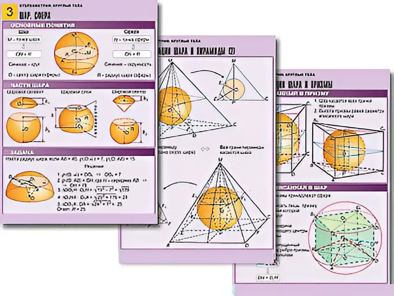 Комплект учебно-наглядных пособий "Стереометрия. Круглые тела" формата А1 с полноцветной двухсторонней печатью и матовой двухсторонней ламинацией в количестве 8 таблиц.