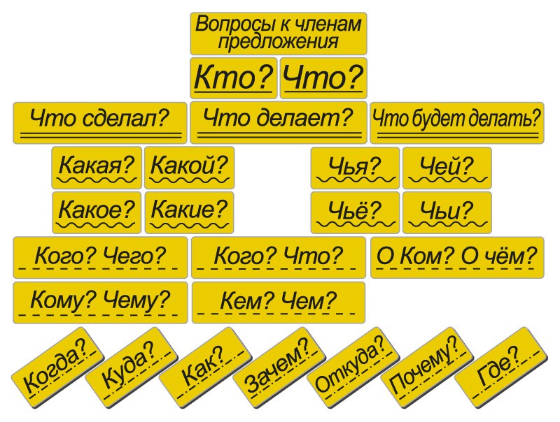 С помощью набора магнитных карточек "Вопросы к членам предложения" ребятам будет легче понять, а учителям проще объяснить разницу между подлежащим и сказуемым, определением, дополнением и обстоятельством.