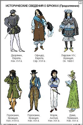 Наглядно-методические материалы комплекта иллюстрируют историю возникновения брюк, правила снятия мерок и построения основ чертежа, разнообразие существующих моделей брюк.