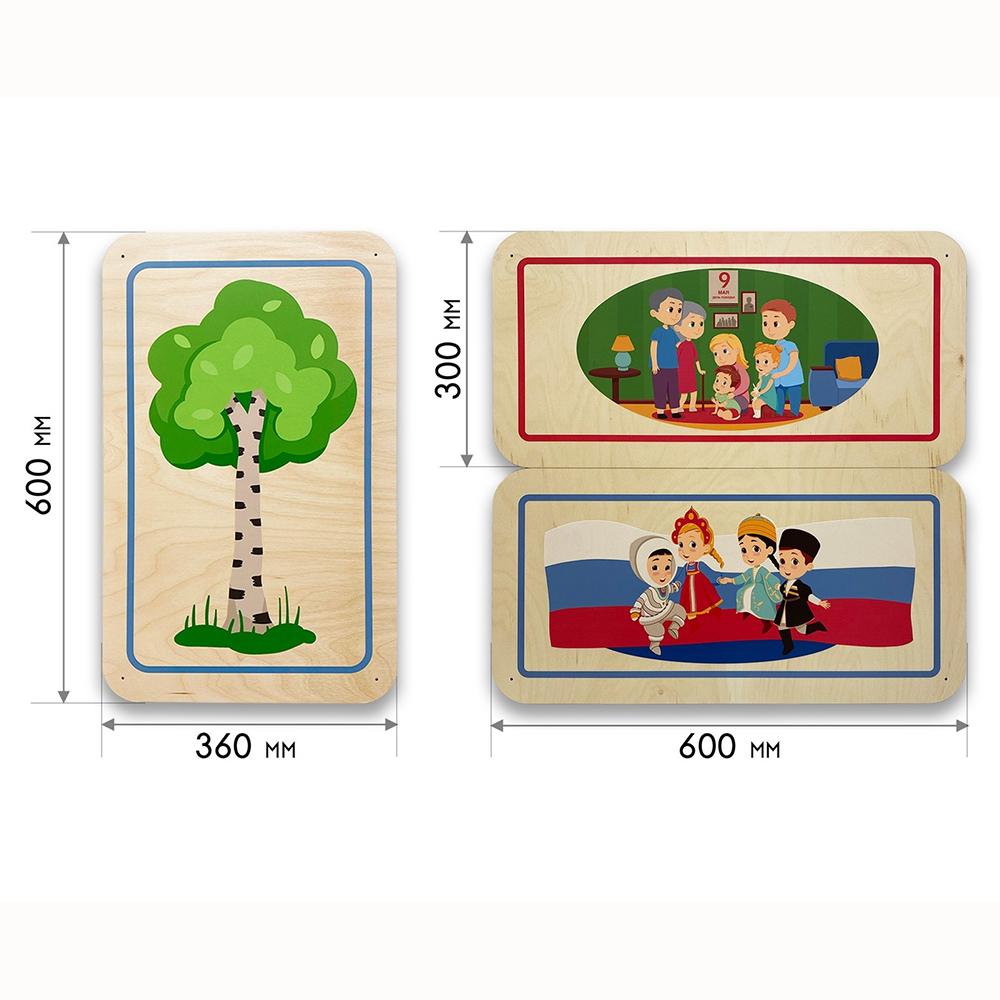 Дополнительные модули бывают однотонные и с тематическими иллюстрациями, подходящими под тематику дидактических панелей. Разнообразие размеров способствует декорированию стен различной конфигурации и масштабов. Параметры варьируются от совсем маленьких модулей 300х300 мм до крупных размеров 600х600 мм.