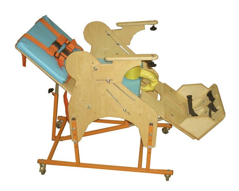 Опора для сидения представляет собой ортопедическое кресло на деревянной раме, расположенной на металлическом четырехколесном основании. Все колеса поворотные, задние колеса оснащены стояночными тормозами. Сидение и спинка оснащены съемными мягкими подушками. На подножке расположены пластиковые крепления для ступней типа «сандалии» с задними упорами и крепежными ремешками. Опора оснащена подголовником и съемным столиком, устанавливаемым на подлокотники.