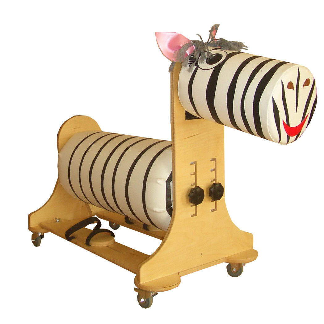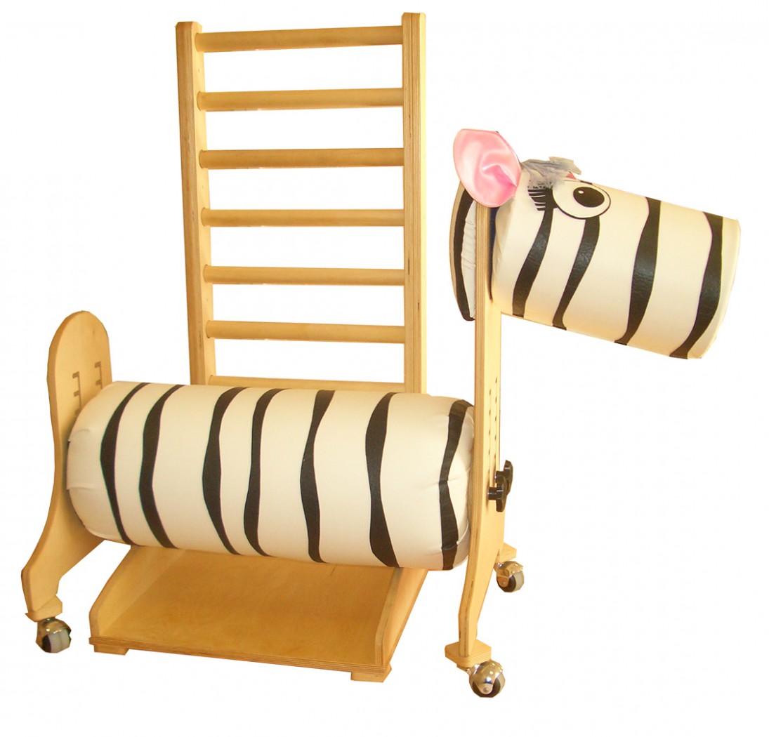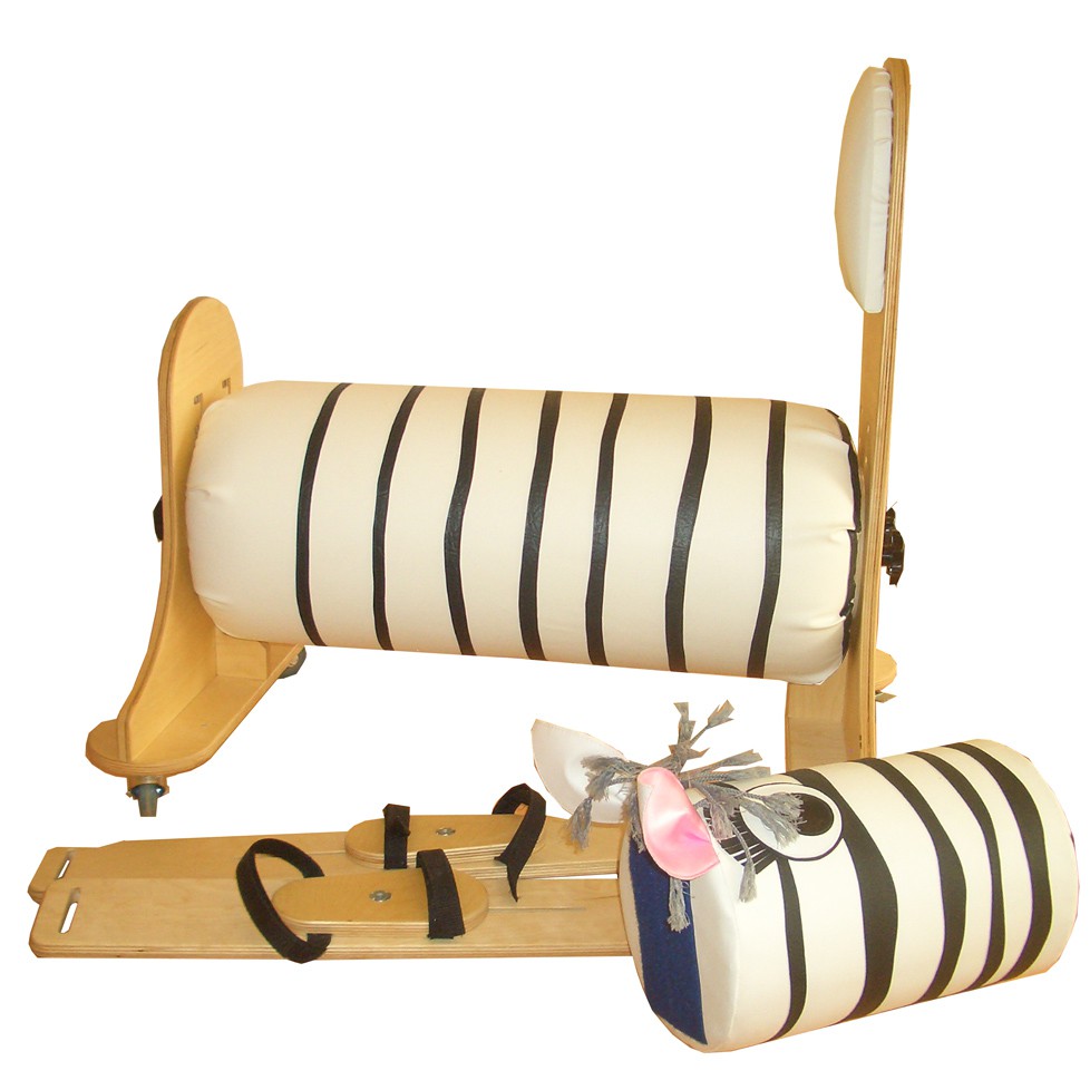 На вертикальных стойках предусмотрено закрепление съемных подножек для крепления стоп . На подножках располагаются крепления для стоп типа «сандалии» съемные, регулируемые. На вертикальной стойке закреплен съемный валик, стилизованный под мордочку зебры, предназначенный для занятий с детьми в игровой форме.