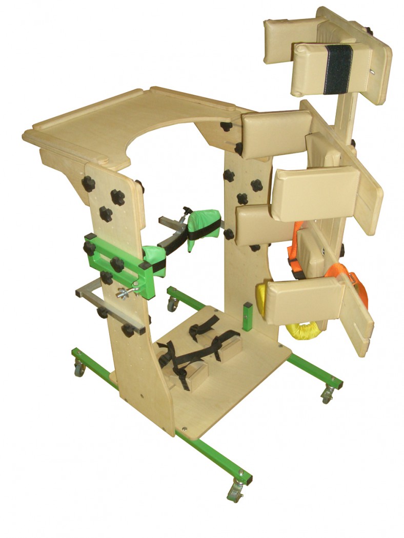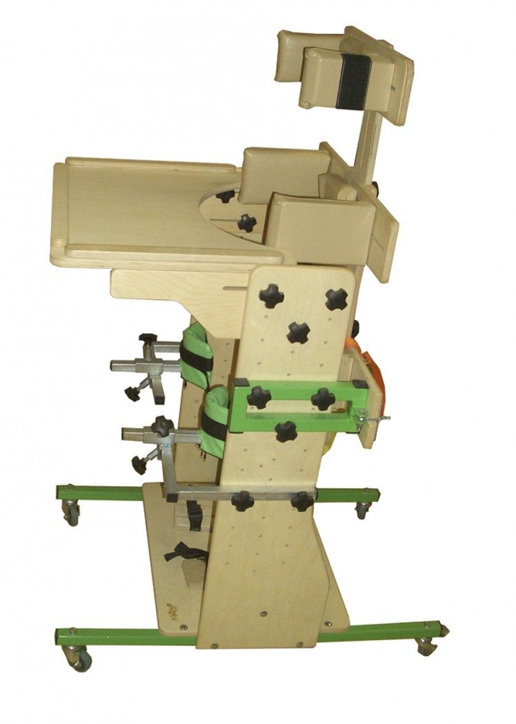 - Деревянная рама, на металлической колесной основе с 4 колесами с тормозами, обеспечивающими возможность перемещения ребенка в вертикализаторе внутри помещения.