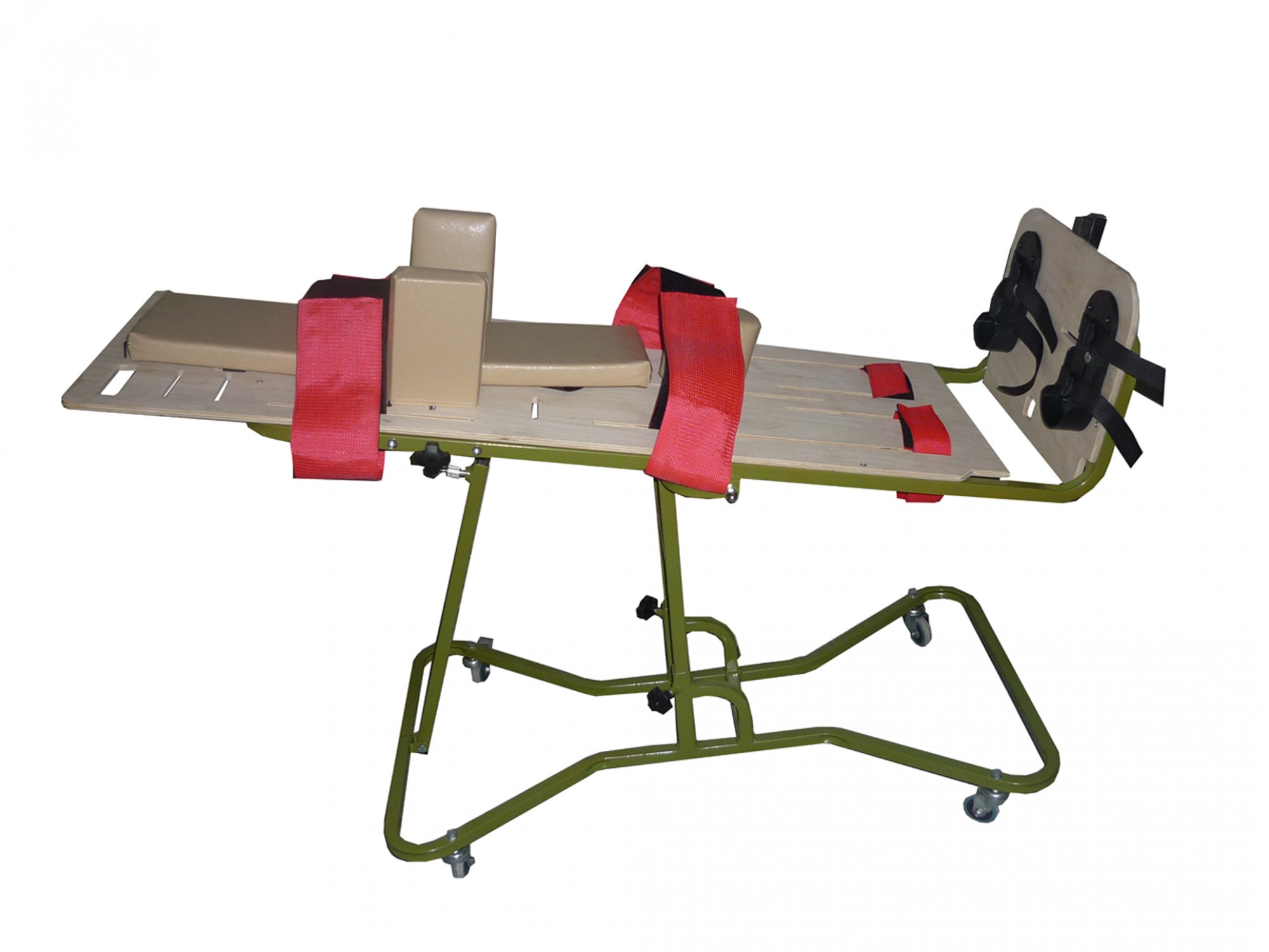 - На ложе расположены крепления для голеней (регулируемые по высоте), тазобедренный ремень (регулируемый по высоте и длине), грудной ремень ( регулируемый по высоте и длине), грудные ограничители регулируемые по ширине.