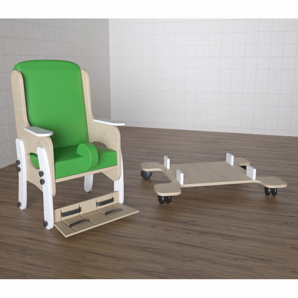 Стул «Адаптация» №4 незаменим для занятий с детьми, имеющими заболевания опорно-двигательного аппарата (ДЦП, сколиоз и т.д.). Конструкция разработана с учётом всех особенностей вышеупомянутых заболеваний. Стул можно отрегулировать до комфортной высоты. Имеет съемную платформу на колесиках, благодаря чему можно без особого труда транспортировать ребенка вместе со стулом. Предназначен для использования дома и в учреждениях с инклюзивным образованием.