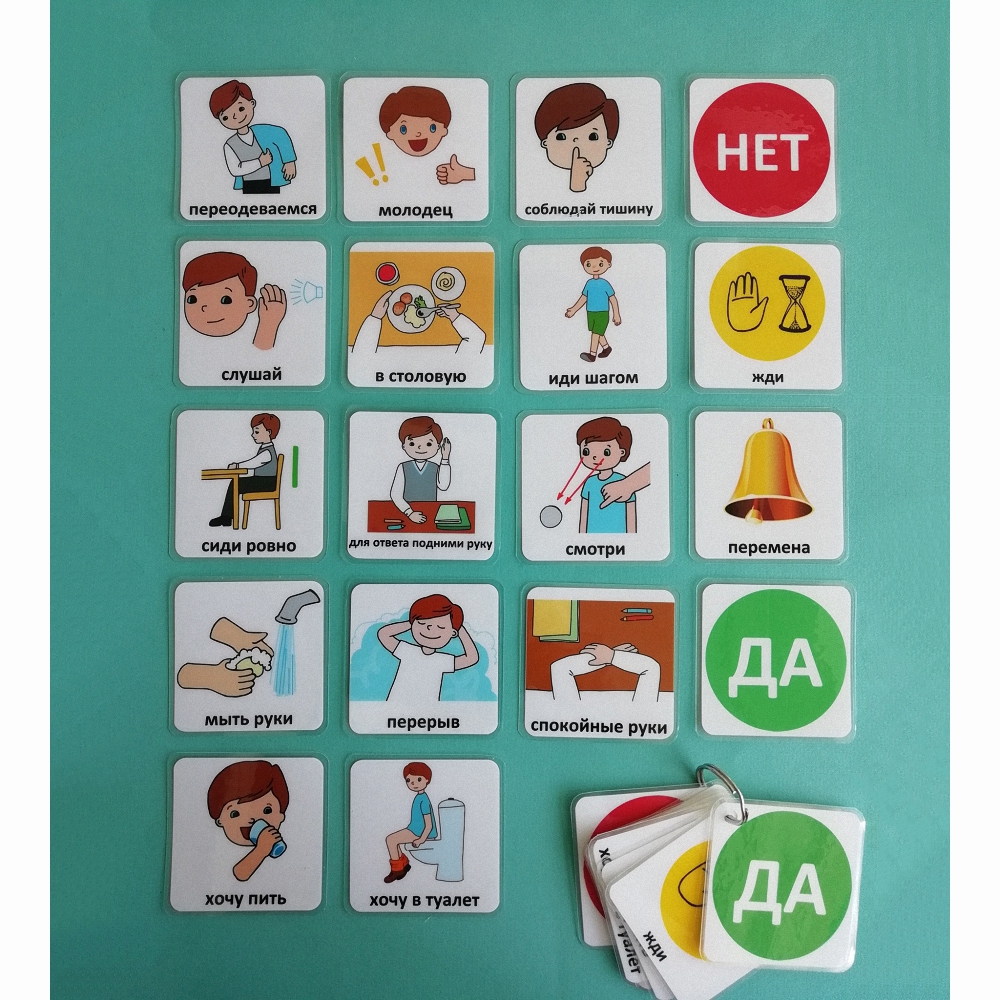 Педагогам и тьюторам может пригодиться визуальный БРЕЛОК, в котором собраны самые необходимые карточки. Например, чтобы показать ученику "соблюдай тишину" или "иди шагом". Иногда это может быть эффективнее, чем вербальные напоминания.