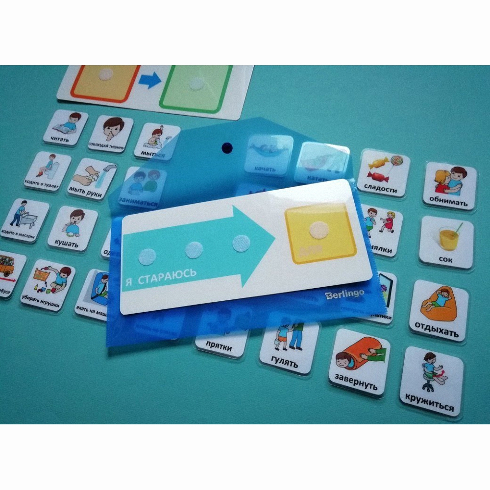 Для использования с таким планшетом необходимо подобрать набор карточек размером 4х4 см. в пластиковом конверте. В качестве основы подойдут наборы карточек «Для расписания» и «Поощрения». Для последующего расширения количества используемых карточек можно приобрести наборы «Повседневные действия», «Еда», «Для детского сада» и другие.