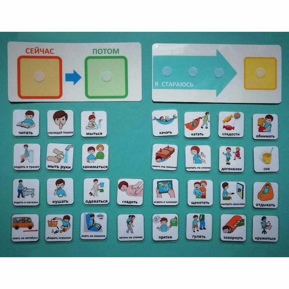 течение дня, либо во время какого-то одного занятия или события. Один из вариантов - это планшетка с картинками или словами, обозначающими действия. Они расположены в порядке выполнения.