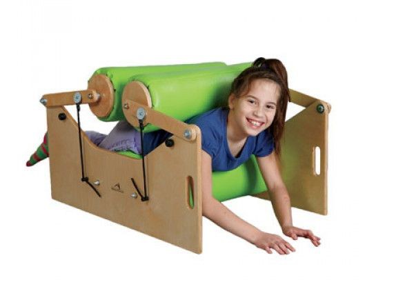 Данное устройство выполняет сразу 2 функции: обьятие ребенка и успокаивающее глубокое давление. Устройтво изготовлено из паралона,фанеры и резиновых шнуров . Давление на ребенка  легко регулируется и может быть подобрано исходя из его физических данных,  что позволяет выбрать подходящий уровень проприоцептивной обратной связи для каждого ребенка.