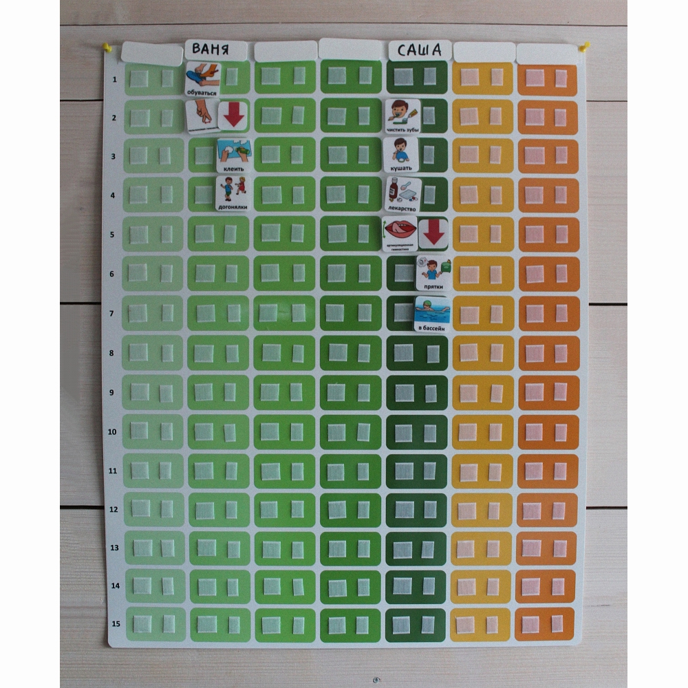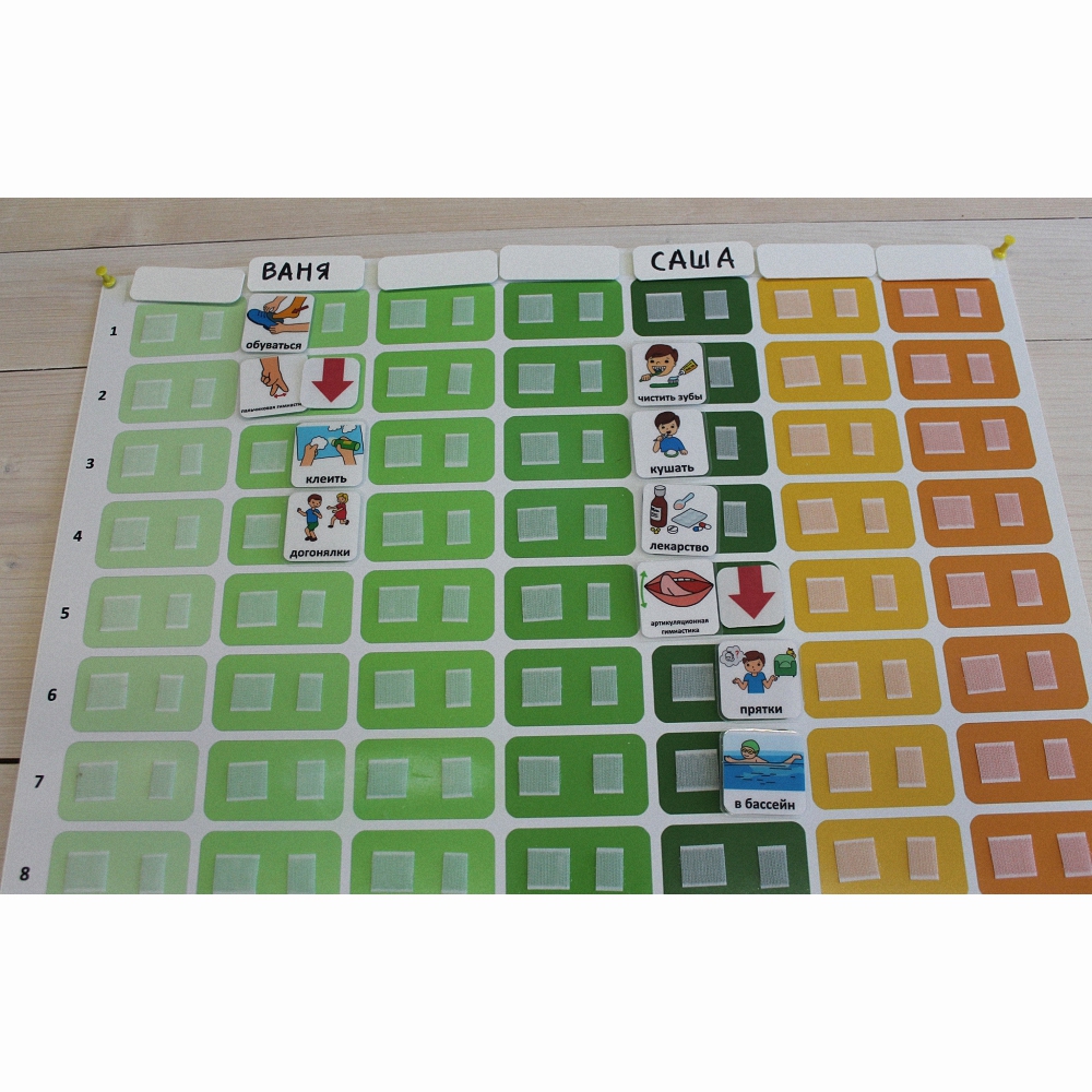 Вариант №1: Пустые карточки располагаются в верхней строке, на них пишутся имена детей в группе. Столбцы панели используются как вертикальные визуальные расписания для детей. При этом в каждой ячейке имеется 2 липучки, что позволяет либо переставлять карточки, либо использовать цветные жетоны, чтобы отмечать успешно выполненные действия. Жетоны можно приобрести отдельно.