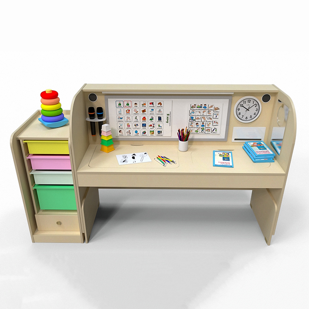 В комплекс дополнительно входя маркеры, магниты, поощрительные наклейки, наборы для развивающих материалов, дидактические пособия для педагогов и т.д. В стол встроено логопедическое зеркало, магнитно-маркерная доска, модульный стеллаж, 2 микрофона, интерактивный планшет диагональю в 25 дюймов. Предусмотрена индукционная система для усиления звука для слабослышащих. Установлено программное обеспечение PROTECT KIDS для безопасности детей в компьютерной среде.