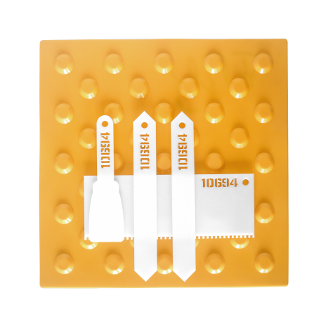 Для укладки плитки на пол в зданиях и помещениях или на улице потребуется зубчатый шпатель, поскольку он, в отличие от шпателя с прямой гранью, даёт возможность наносить клей ровным слоем. Кроме того, такой шпатель «выгоняет» из клеевой массы пузыри воздуха, которые могут снизить качество приклеивания плитки. Шпательная лопатка предназначена для нанесения клея на индикаторы для приклеивания конусов и полос. Расшивка — служит для обработки швов, с их помощью удаляют излишки клея. Удобная для работы пластмассовая рукоятка оснащена отверстием для подвешивания изделия после применения.