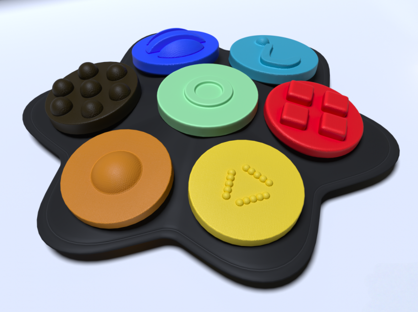 Полностью тактильный коммуникатор 7-кнопочный многоуровневый предназначен для детей, имеющих проблемы со слуховым восприятием, самостоятельным воспроизведением речи и коммуникацией. Представляет собой корпус сложной формы, на котором размещены 7 текстурированных кнопок (кнопки разного цвета, и каждая имеет свою рельефную поверхность). Изготовлено из высококачественного ударопрочного пластика, имеет обтекаемые плавные формы без острых краёв и углов.