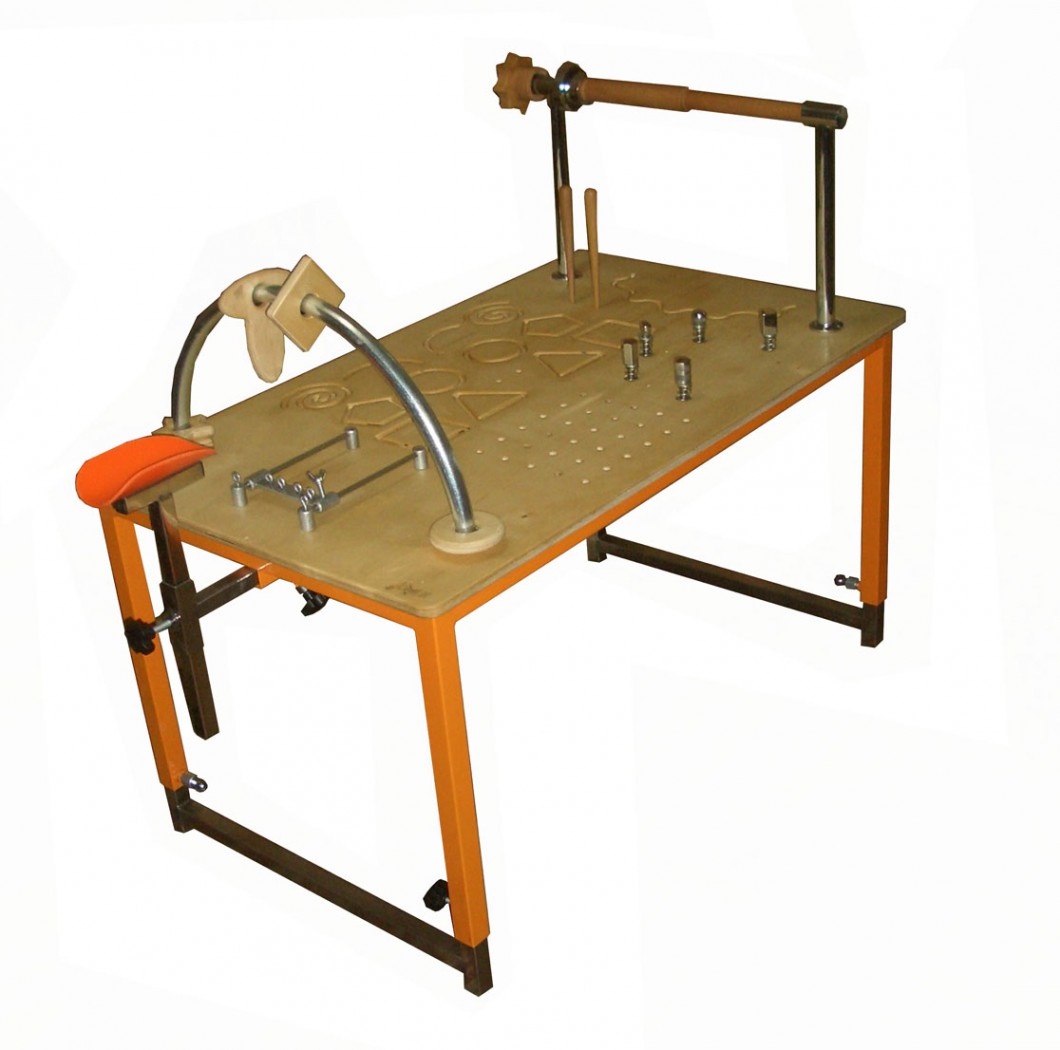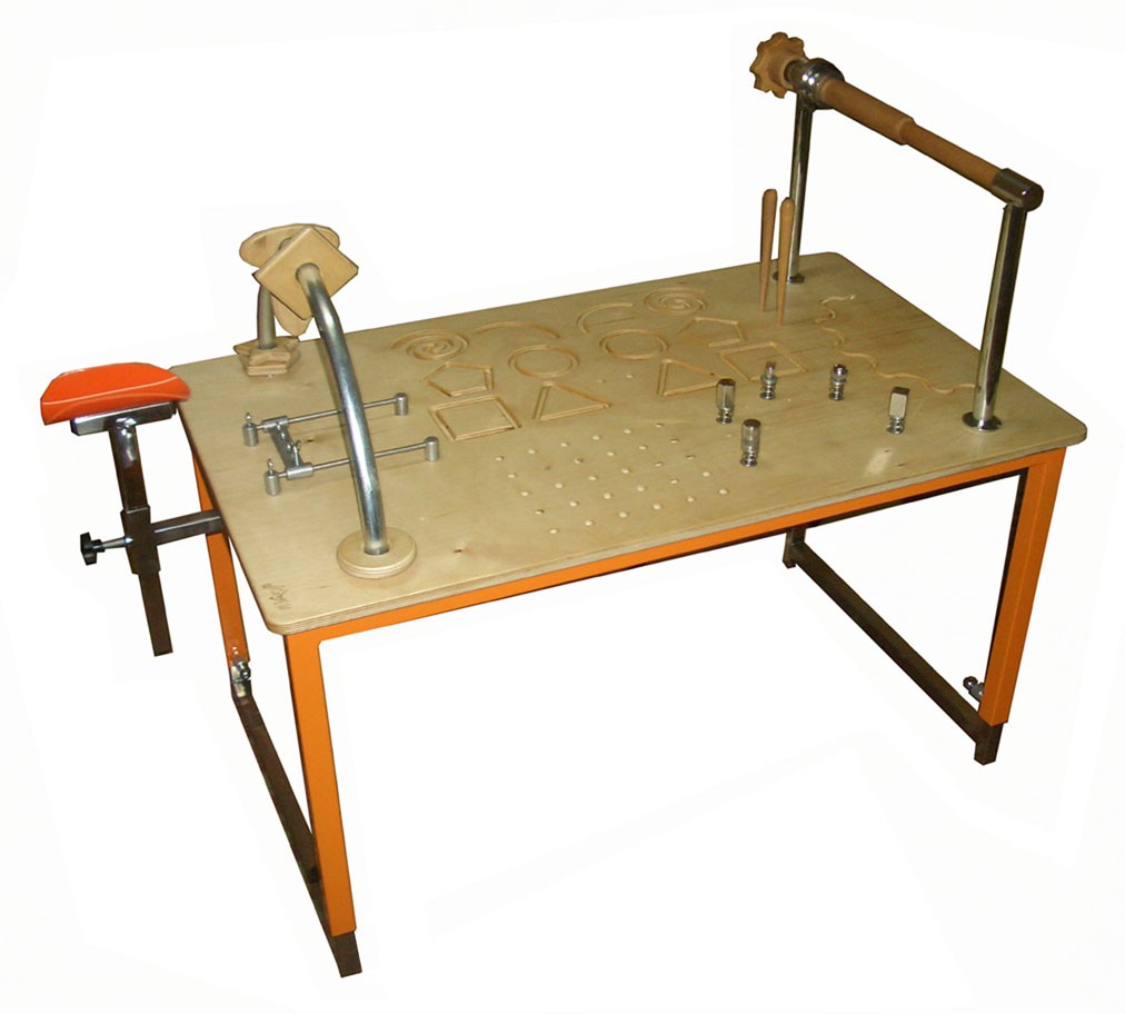 Стол с размещенными на столешнице различными тренажерами для развития силы мышц верхних конечностей, механотерапии и развития мелкой моторики. Основное назначение: для специальных упражнений, восстанавливающих и корректирующих движения верхних конечностей от плечевого до пястно-фаланговых суставов. Предназначен для работы со всеми возрастными группами пациентов - от детей (от 3 лет) до гериатрических пациентов.
