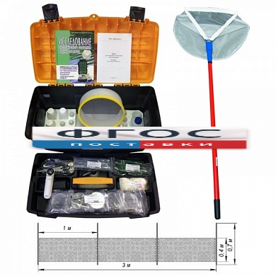 Набор дополнен сачком гидробиологическим специальным и сетью гидробиологической.