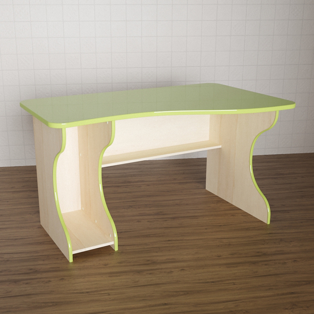 Детский стол “Учеба в радость” нужен для групп в ДОУ, подойдет также для занятий в начальных классах, коррекционных и развивающих центрах. Он имеет очень практичную конструкцию «взрослого» компьютерного стола. Удобно расположенные полочки позволяют хранить книги и игровые наборы. Весь модуль имеет цвет натуральной древесины, кроме столешницы – она окрашена в нежный зеленый цвет. За ним можно разместить 1-2 ребёнка. К столу такой конструкции можно подобрать подходящую по исполнению скамейку.