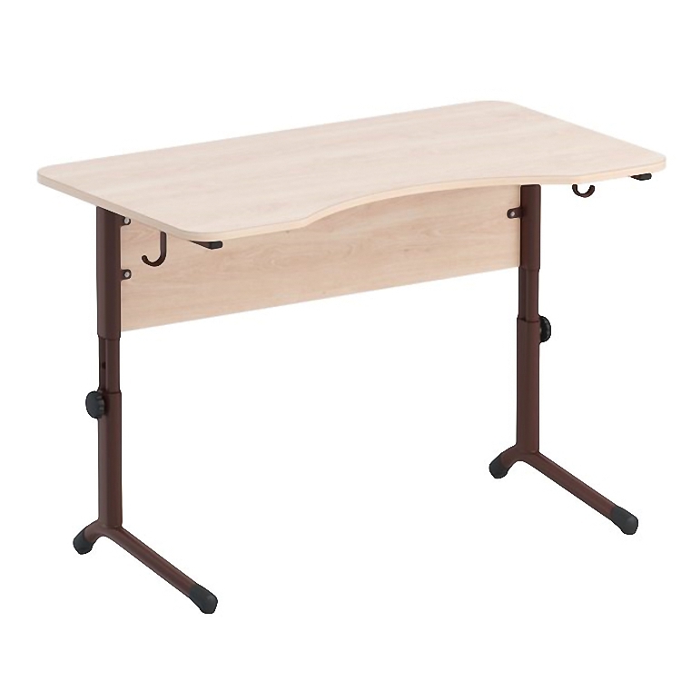 Стол имеет эргономичную столешницу с вырезом для сидящего и загруглёнными углами. Кромки столешницы облицованы кромкой ПВХ толщиной 2мм. Конструкцией стола предусмотрены 2 крючка для порфеля, сумок.