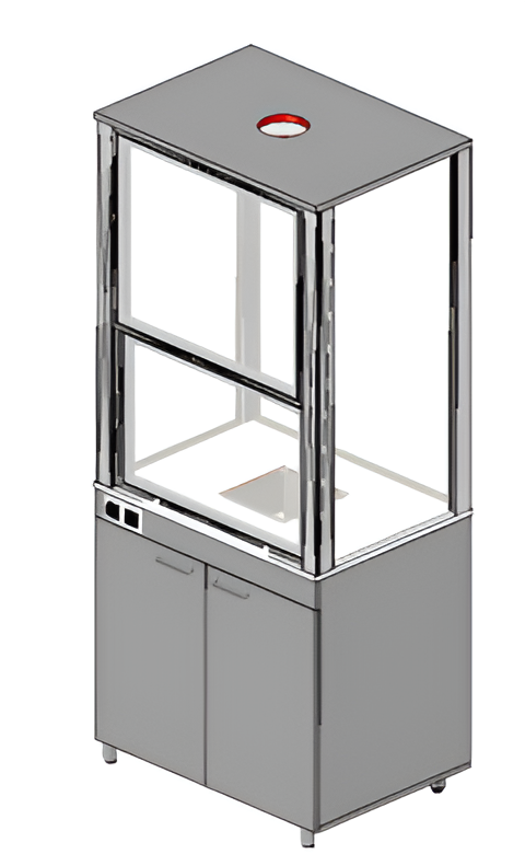 Верхняя часть шкафа со стеклянными стенками из органического стекла, которые крепятся к металлическому каркасу, имеет в передней части дверь из оргсекла в алюминиевом профиле поднимающуюся вверх при помощи специального механизма. Дверь может фиксироватся в любом положении. В верхней части рабочего отделения имеется выходное вентиляционное отверстие для установки вентиляционного рукава круглой формы.