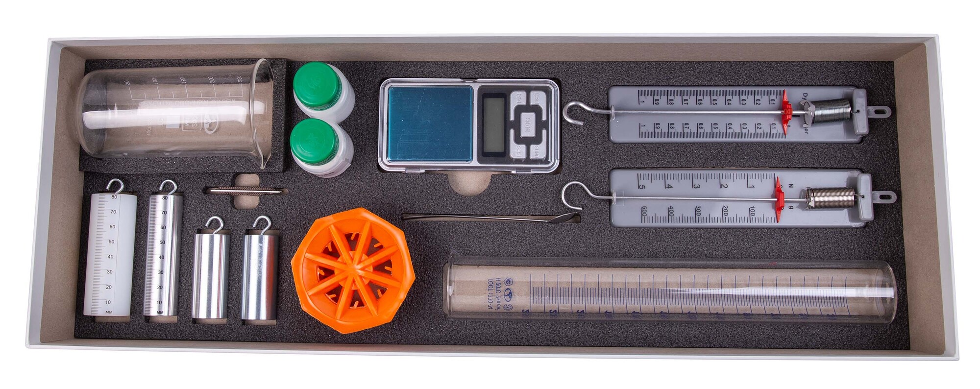Комплект позволяет измерять среднюю плотность вещества и архимедову силу, исследовать зависимость архимедовой силы от объема погруженной части тела и плотности жидкости, а также независимость выталкивающей силы от массы тела.
