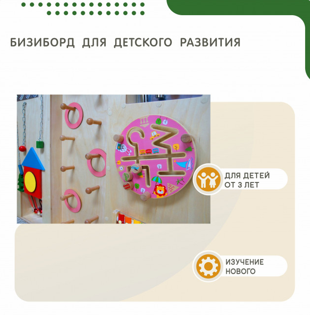 • Бизиборд с цепочками-колечками отлично подходит для игры как в домашней обстановке, так и в детских учреждениях.