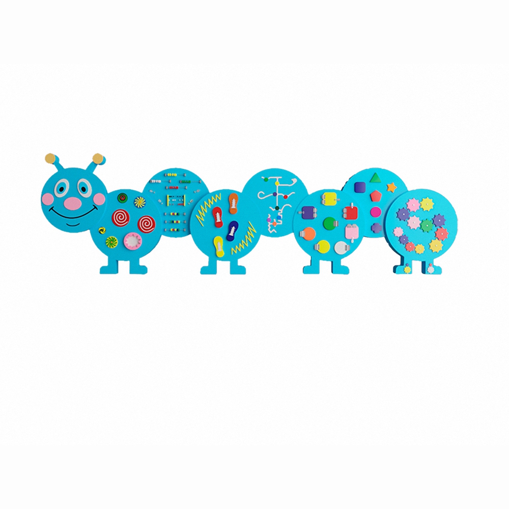 Бизиборд в виде синей гусенички №1 не только украсит любую детскую комнату, развивает умственные качества ребенка, но и имеет приятный голубой цвет, который в своем роде бережно влияет на нервную систему, помогая ребенку успокоиться и сконцентрироваться на занятии.