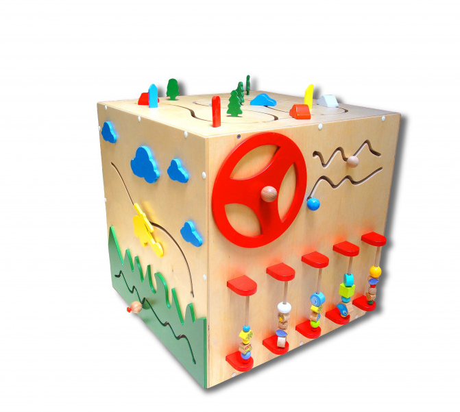 Бизикуб - это развивающее оборудование, заменяющее 5 отдельных бизибордов и предназначенное для детей от 3-х лет. Изготовленный из натуральной древесины, он компактный и мобильный, позволяя ребенку развиваться и играть в любом месте. Шестеренки, шнуровка, часы, крутящиеся элементы, цифры, тактильные ячейки, руль, счеты, одежные застежки и тактильные лабиринты - всем этим оснащен наш Бизикуб №1, и все это помогает развивать моторику и логическое мышление ребенка.
