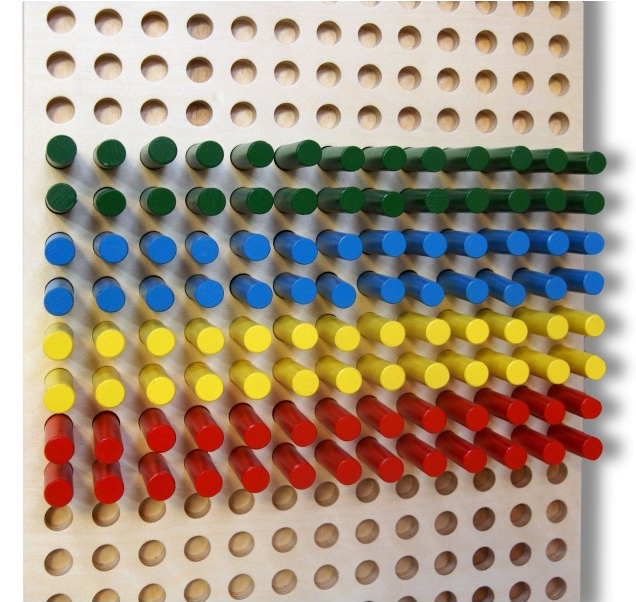 Деревянные штырьки разного цвета вставляются в любом порядке в отверстия основы так, чтобы получилась картинка. Колышки можно переставлять сколько угодно раз, создавая новые картинки и развивая воображение и мелкую моторику пальцев в лёгкой игровой форме.