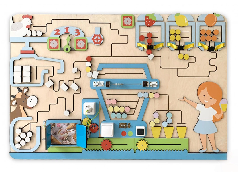Комплект бизибордов на тему фабрики мороженого полностью соответствует своему названию – тут изображено настоящее фабричное производство мороженого со всеми его этапами, начиная от получения животной продукции (молока и яиц) для приготовления, и заканчивая аппетитными рожками прохладного лакомства (боковые бизиборды). Имеются и другие приспособления для развивающей детской игры.