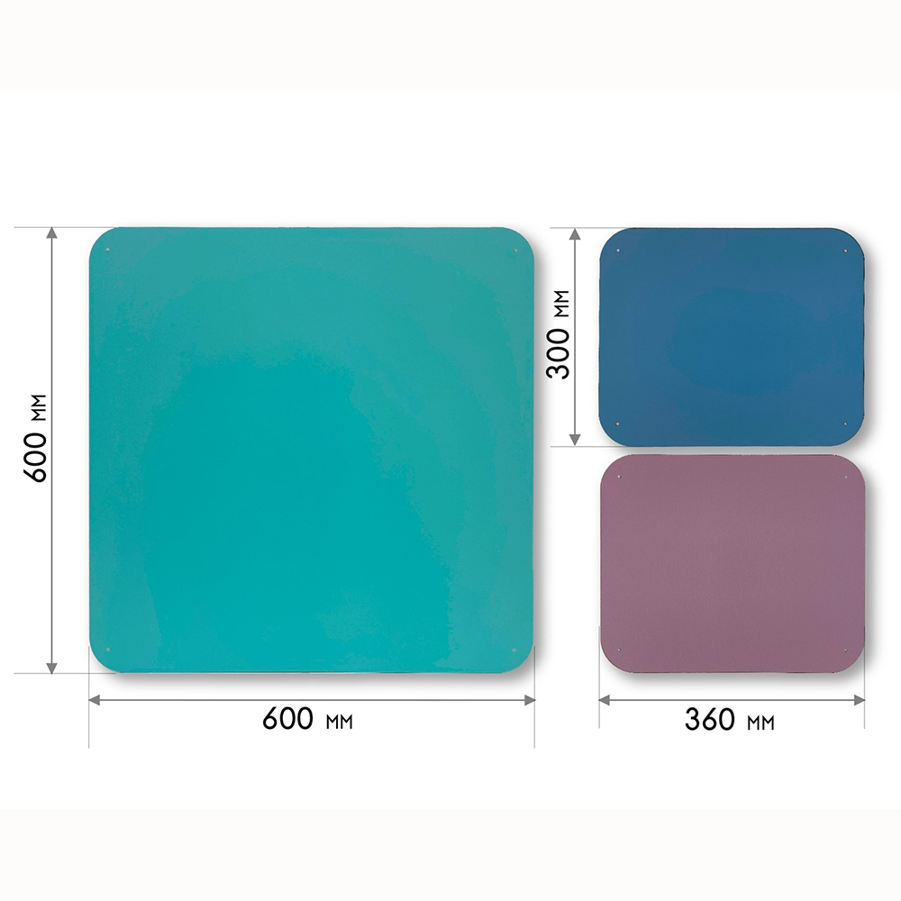 Дополнительные модули бывают однотонные и с тематическими иллюстрациями, подходящими под тематику дидактических панелей. Разнообразие размеров способствует декорированию стен различной конфигурации и масштабов. Параметры варьируются от совсем маленьких модулей 300х300 мм до крупных размеров 600х600 мм.