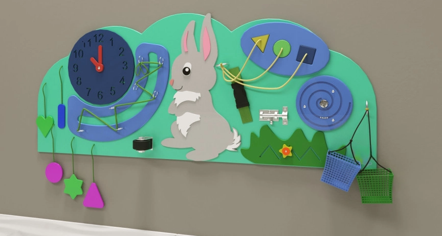Настенная панель с зайчиком — детский модуль с высокой игровой ценностью, с его помощью можно не просто занять ребёнка, но сделать это с пользой для его развития. А ещё настенную панель легко расположить в небольшом помещении благодаря компактному исполнению, что выгодно отличает её от объёмных аналогов. Основание исполнено в форме светло-зелёного силуэта кустика, на фоне которого размещены зайка, полянка с травкой и разнообразные тактильные приспособления для игры. Поверхность обработана специальным образом и имеет многослойное покрытие из экологически безопасных материалов.
