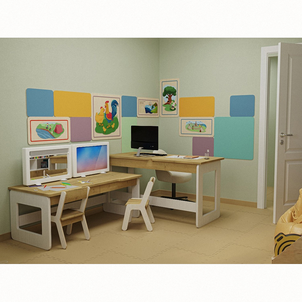 Готовое решение по оснащению кабинета логопеда. Содержит всё необходимое современное оборудование для эффективной работы детского специалиста: стол логопеда с компьютером, рабочий стол для детей, интерактивную панель с профильным ПО для логопедов «Звукоречье», дидактическую панель «Азбука речи», набор корпусной и мягкой мебели, безопасные зеркала, нейротренажеры, методические материалы и пособия.