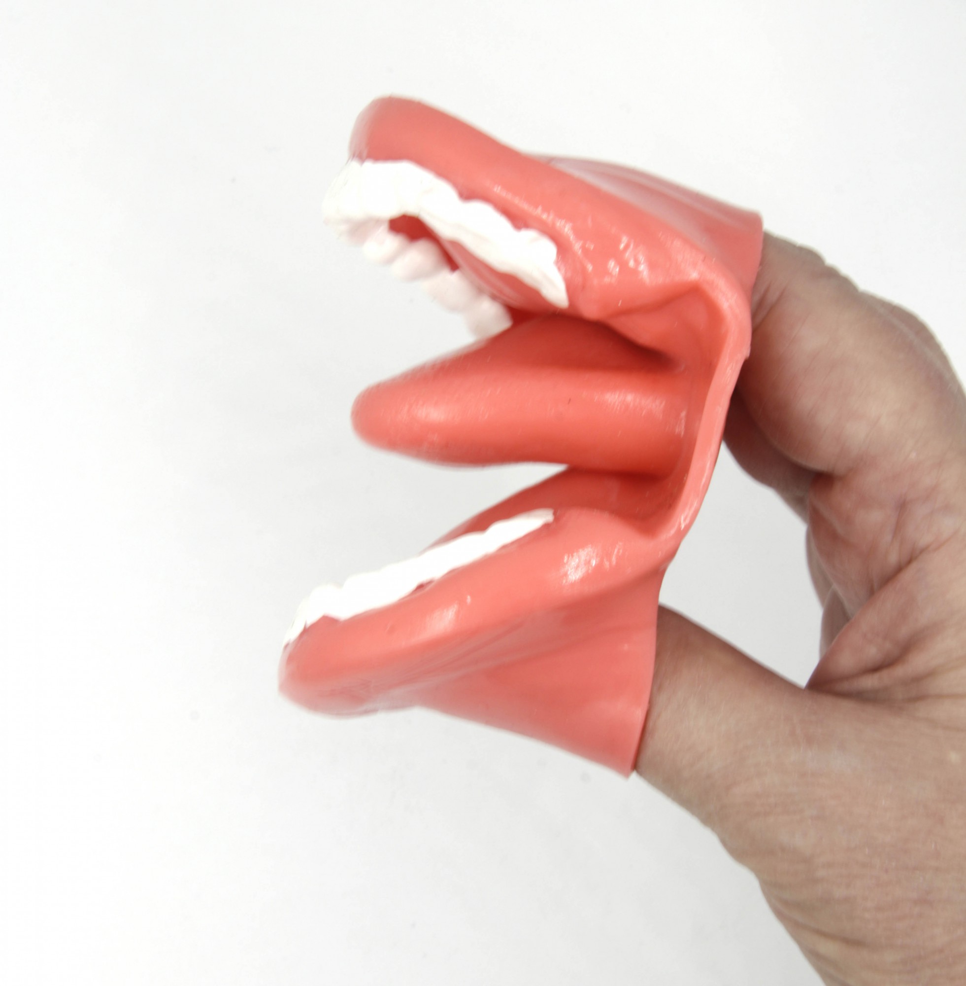 Ребенок может сам манипулировать этим муляжом. Его размеры позволяют ребенку вставить пальчики в кармашки и имитировать движения челюстями и языком.