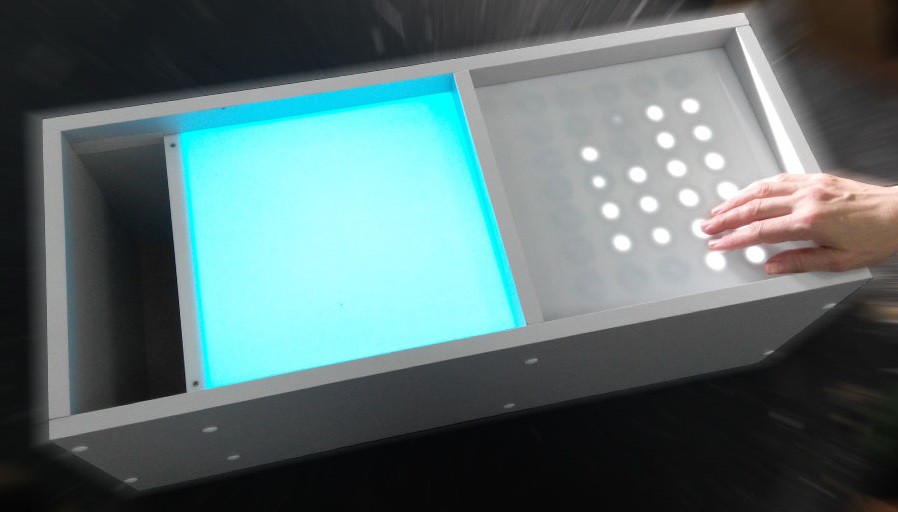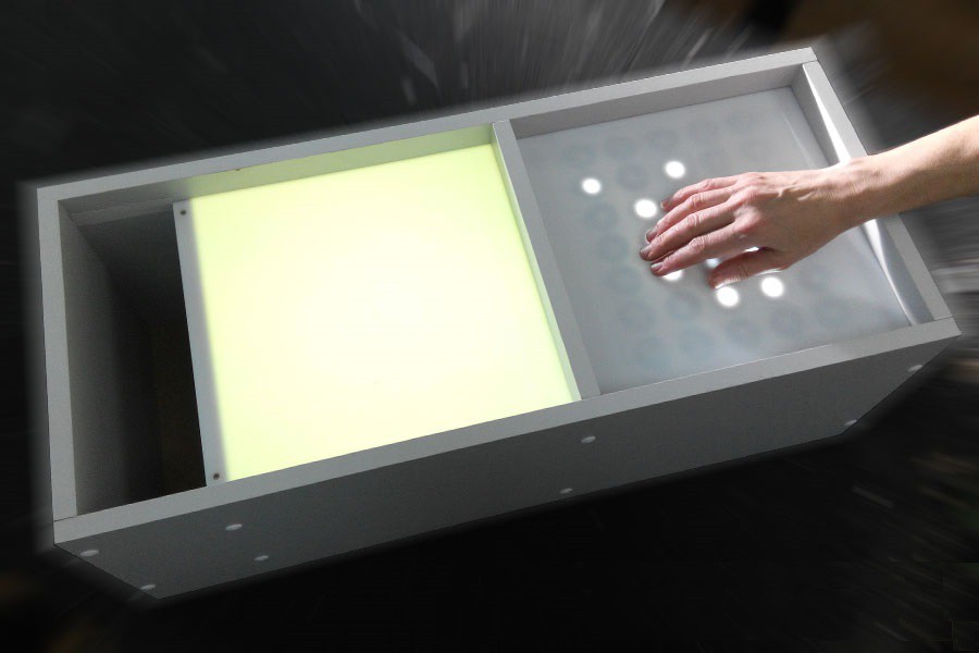 - Сенсорное поле, при прикосновении к которому зажигаются источники света, расположенные под матовым стеклом. Если вести пальцем по поверхности матового стекла - появится светящаяся дорожка. Таким образом, можно рисовать различные световые фигуры на поверхности стола. Светящаяся дорожка гаснет через некоторое время.