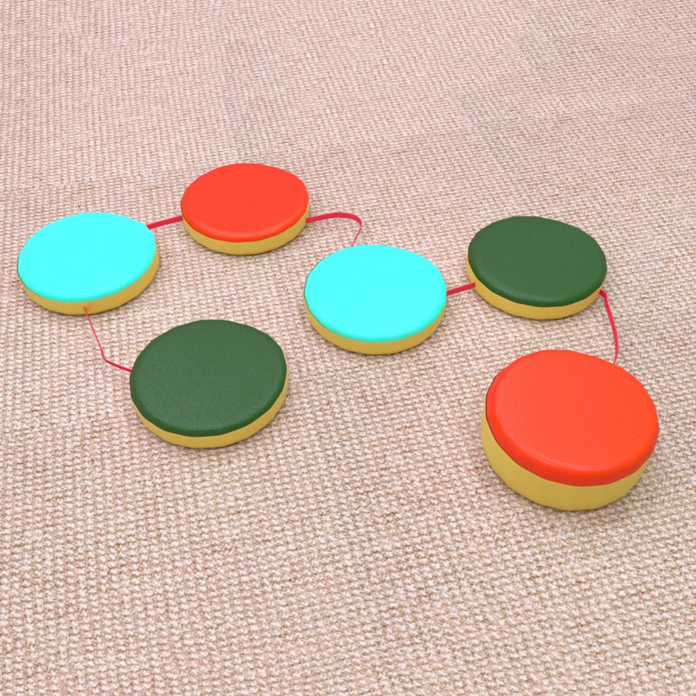 Модель «Змейка-шагайка» относится к спортивно-игровой разновидности мягких бескаркасных модулей. Внешне представляет из себя набор мягких поролоновых дисков одинакового диаметра и разных по толщине. Диски соединены между собой верёвочкой; из-за этого игровой набор чем-то напоминает координационные тропы или дорожки прыг-скок, так как с ним можно выполнять некоторые аналогичные упражнения - просто ходить, обучаясь соблюдению равновесия и тренируясь сохранять правильную осанку, или перепрыгивать её поперёк, использовать дорожку в качестве своеобразного рубежа, через который нужно перекинуть предмет (мячик, грузик - мешочек с наполнителем) – широта диапазона использования зависит от фантазии педагога; кроме этого, набор «Змейка-шагайка» используется в качестве приспособления для исполнения комплексов общеукрепляющих упражнений. Несомненные плюсы этой дорожки – отсутствие твёрдого, жёсткого каркаса и наличие мягкого, упругого наполнителя, ведь это гарантирует безопасность в использовании. Не требует сложных условий в уходе.