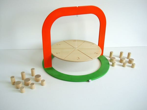 Бросаем игровую кость. В соответствии с цифрой, которая выпала, выбираем сектор на подвесной тарелочке, на данный сектор ставим фишку необходимого размера. Размер фишки и её расположение на секторе тарелочки необходимо подобрать так, чтобы тарелочка не перевернулась. Если игрок не справляется с заданием и фишки падают с тарелочки, то игрок забирает упавшие фишки себе. Побеждает тот, у кого не осталось ни одной фишки.