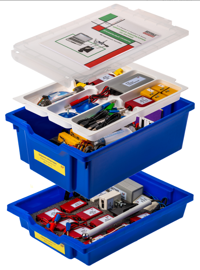 Все оборудование цифровой лаборатории (кроме скамьи лабораторной) укомплектовано в пластиковые системы хранения, которые закрываются прозрачной пластиковой крышкой на защелках для обеспечения наблюдения за содержимым. Комплект оборудования и датчики в системах хранения располагаются на ложементах в индивидуальных ячейках.