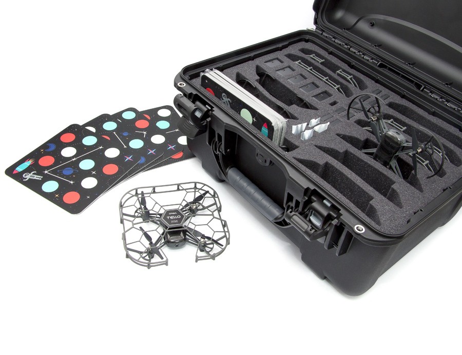 • Стая Дронов – ученики смогут запрограммировать полет нескольких DJI Tello EDU, используя одно устройство. Благодаря коду в среде Python, стая будет летать над полетными карточками, делая перевороты и другие акробатические фигуры.