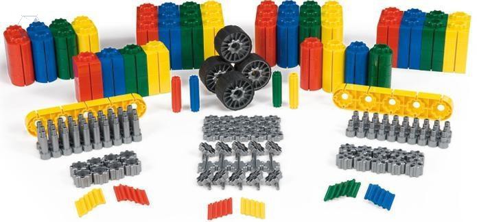 Крупногабаритный конструктор. Набор с различными блоками, винтами, гайками, колесами и шинами, которые можно соединить инновационными способами сборки.