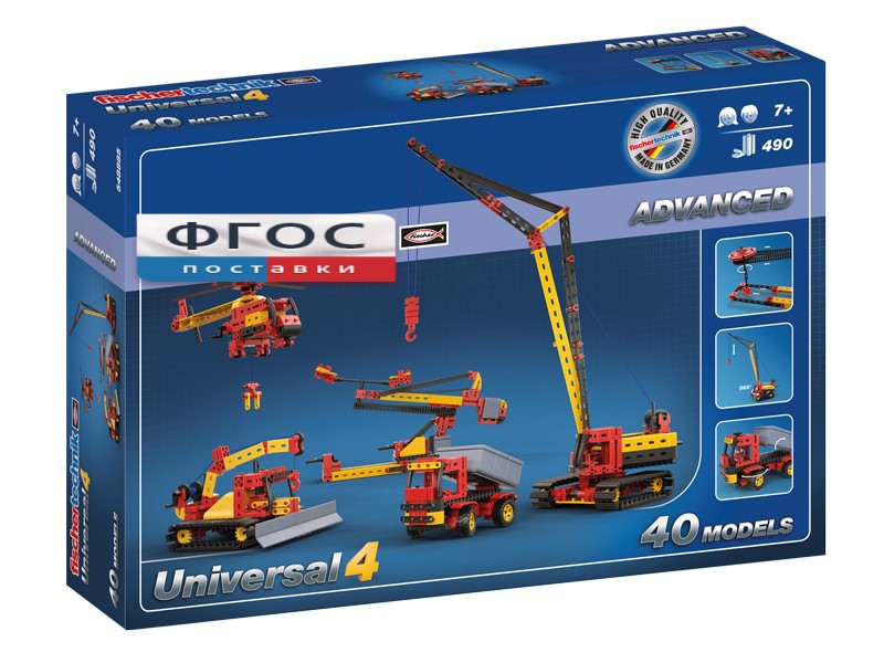 Конструктор прекрасно подходит для изучения простых машин и механизмов. Из набора можно собрать 40 моделей из 490 деталей: автомобили и грузовики с рулевым управлением, бульдозеры с гусеничными приводами, транспортный вертолет с мачтой-передатчиком, конвейерные ленты, различные рычаги, краны и многое другое.