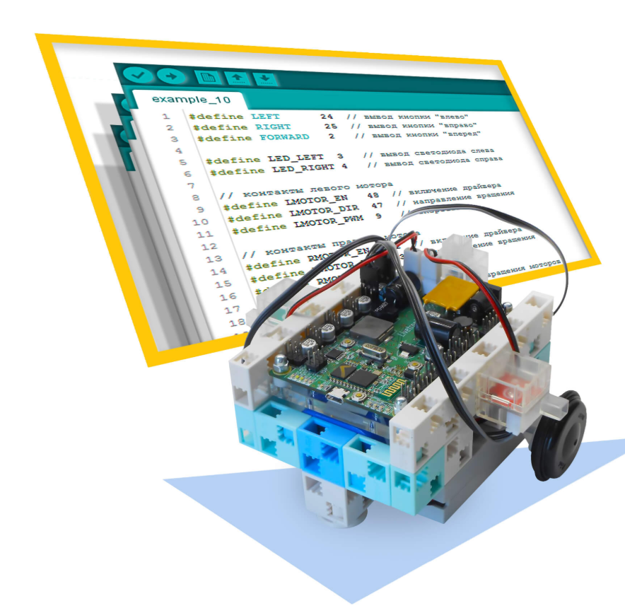 Кроме того, набор познакомит с основными принципами работы электронных приборов (цифровые и аналоговые сигналы, ШИМ модуляция, цифровые протоколы связи), электронными устройствами (светодиод, кнопка, аналоговый и цифровой датчик, сервомотор, мотор постоянного тока, разные устройства индикации) и алгоритмами (цифровые методы обработки сигналов и различные регуляторы), применяемыми в робототехнике и системах с обратной связью.