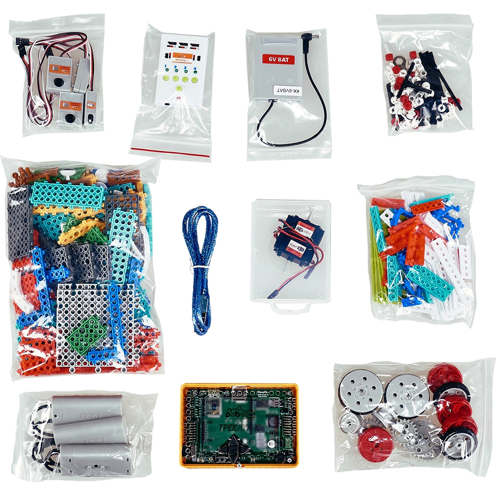 Набор состоит из различных конструктивных элементов (балок, блоков, уголков, шестеренок, колесиков и др.) и электронных и электромеханических компонентов (датчиков, контроллеров, электродвигателей). Все конструктивные элементы выполнены по технологии My Robot Time и соответствуют типоразмерам этой линейки конструкторов.