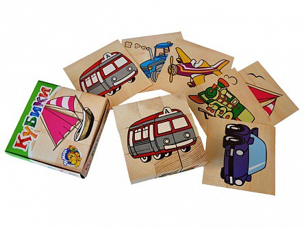 Набор представляет собой комплект кубиков с изображениями фрагментов различных транспортных средств, каждое из которых состоит из девяти кубиков. Набор кубиков предназначен для ознакомления детей от 1 до 6 лет с такими транспортными средствами, как автомобиль, троллейбус, парусник, паровоз, автобус и самолет, а также для развития логического мышления, сосредоточенности, внимания и мелкой моторики рук.