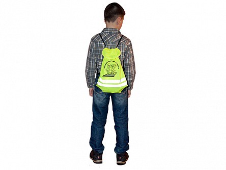 Световозвращающий рюкзак представляет собой мягкий заплечный мешок желтого цвета с двумя световозвращающими полосками, по бокам которого находятся две лямки, наверху – текстильная застежка, внизу – вставки из кожзаменителя с люверсами, а спереди нанесен рисунок и слоган.